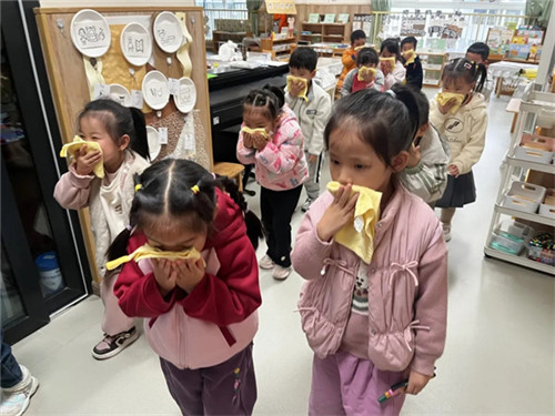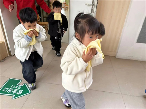 随着急促的警报声响起,全园师幼立即停止一切活动,迅速进入戒备状态,孩子们迅速拿起湿毛巾、捂住口鼻、低头弯腰,不惊慌、听指挥、动作敏捷,有序地撤离到安全地带。