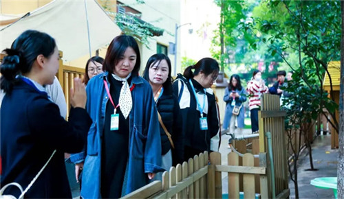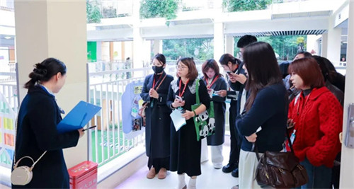 专题分享结束后,入园观摩的老师们按组别分为粉色组、蓝色组与绿色组,在刘老师、徐老师、樊医生引导下开展全方位实地环境参观。参观路线覆盖户外与室内关键区域,从户外器械的安全布局与分层投放、木工区的工具收纳与创意材料陈列,到户外建构区的材料分类摆放与师幼共构标识,再到各班级的区域划分、主题墙创设及生活环节布置,老师们细致考察了环境创设中的每一处细节。