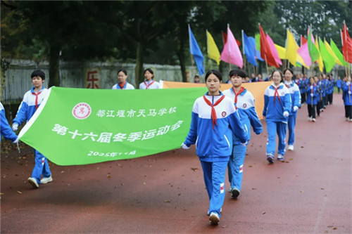庄严的国歌响起,全场肃立。歌声激荡,唤醒了全体师生内心深处的爱国之情与拼搏之志。天马学校副校长周波为开幕式致辞。他希望运动员——发扬“更快、更高、更强——更团结”的奥林匹克精神,遵守规则,尊重裁判,赛出风格和水平,做到“友谊第一,比赛第二”。当周波宣布“都江堰市天马学校第十六届冬季运动会正式开幕”时,操场上瞬间沸腾,欢呼声与掌声交织,微风吹过,满是青春的热烈。