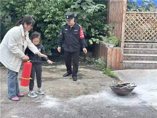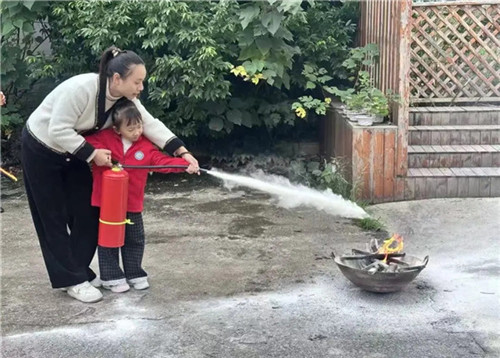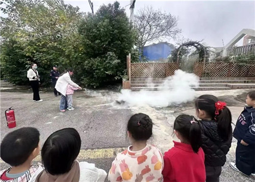 在老师专业的示范和看护下,孩子们亲手尝试了如何使用灭火器。“一提、二拔、三握、四压”,孩子们在模拟灭火的场景中,化身成勇敢的“小小消防员”,真正掌握了灭火器的操作要领,成就感满满。