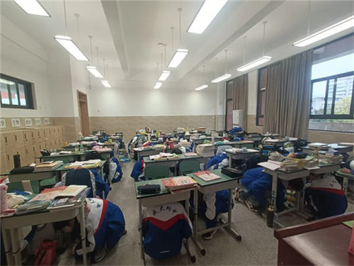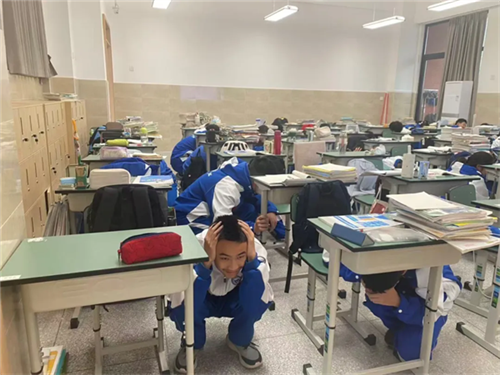 随着警报第一次拉响,各班班主任与第二节课科任教师协同配合,立即组织学生进行室内避险。同学们在老师指引下,迅速转移至教室支柱旁、墙角、课桌下等安全区域,规范完成双手抱头、屈膝下蹲的避险动作,全程保持安静、秩序井然。本阶段持续约3分钟,至第二次警报响起结束。