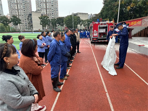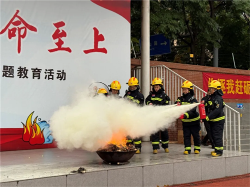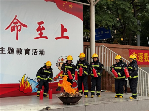 在消防知识宣讲后,活动进入了实战环节——师生代表进行灭火器操作展示。来自不同年级的教师与学生代表严格按照操作规范,成功使用灭火器扑灭了预设火点。此举不仅为全体师生提供了标准化的操作示范,更极大地增强了大家在突发火情面前的自救互救信心与实战能力,将“预防为主,防消结合”的消防方针落到了实处。
