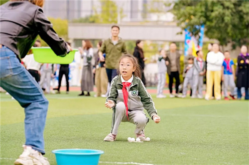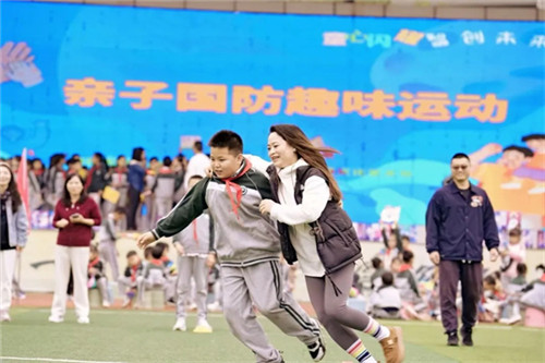 “家园卫士”亲子国防趣味运动会分年级进行。“穿越铁索桥”“后勤物资运输”“战场救护”……家长与孩子默契配合,在趣味运动中强化国防意识,在协作中增进亲子情感。