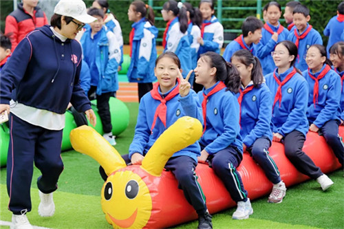二至五年级学子化身“运动小勇士”,在“毛毛虫竞速”中协同进退,在“障碍接力跑”中跨越栏架、钻过呼啦圈,在“车轮滚滚”中感受团队协作的力量。充气毛毛虫道具在孩子们的呐喊声中“扭动前行”,彩条编织的“车轮”在阳光下滚动出青春的轨迹,整个操场成为欢乐的海洋。