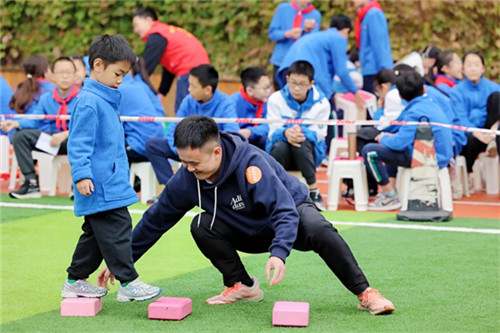 “爸爸加油!妈妈快点!”南苑操场的“亲子赛道”上,呐喊声与欢笑声交织。本次运动会创新性地将“家长力量”引入赛场,设计毛毛虫亲子赛、踏石过河大挑战两个亲子协作项目,让家校共育从课堂延伸到运动草坪;运动是最好的沟通语言,当家长与孩子一起流汗、一起呐喊,教育的温度便自然流淌。“踏石过河”环节里,家长沉稳铺路、孩子轻盈跳跃,在泡沫垫铺就的“过河之路”上谱写协作赞歌。