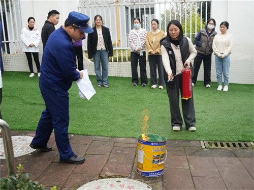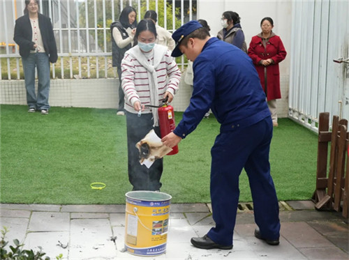幼儿园组织全体教职工进行了灭火器实操培训。消防员详细讲解了干粉灭火器的使用口诀——“提、拔、握、压”,并指导大家操作使用灭火器,确保在突发情况时能“拉得出、用得上”,为孩子们的安全再加一道“防护盾”。