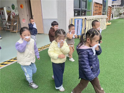 警报声响起后,在老师的带领下,孩子们用湿毛巾捂住口鼻,沿着预定路线有序排队、快速撤离,安全抵达指定地点,各班老师迅速清点人数,确保每位幼儿安全撤离。