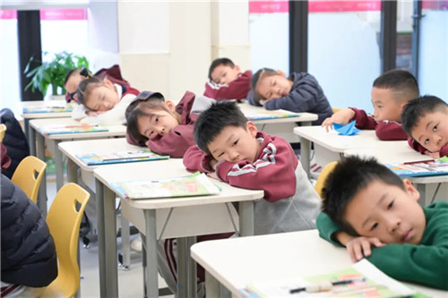 课前,孩子们会根据课程表,整齐摆放好科目书本与文具,然后静静地伏案休息,等待课堂的开始。
