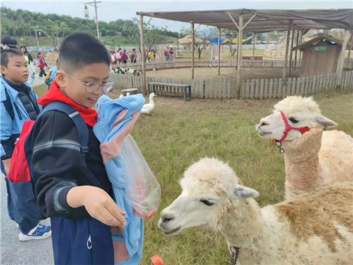 果乐牧场里,最吸引同学们的莫过于形态独特的火鸡、羽衣斑斓的孔雀和温顺可爱的小羊。火鸡拖着蓬松的尾羽昂首踱步,模样憨态可掬;孔雀时而梳理华丽的羽毛,时而展开尾屏,引得大家阵阵惊呼;小羊则依偎在围栏边,眼神温柔又灵动。同学们轻手轻脚地靠近,有的蹲在一旁静静观察火鸡的姿态,有的对着开屏的孔雀轻声赞叹,还有的温柔抚摸小羊柔软的绒毛,脸上满是欣喜与宠溺。大家用最轻柔的动作与小动物互动,眼神里满是对这些生灵的喜爱,在近距离接触中感受着生命的鲜活,真切体会到人与动物和谐共处的温暖。