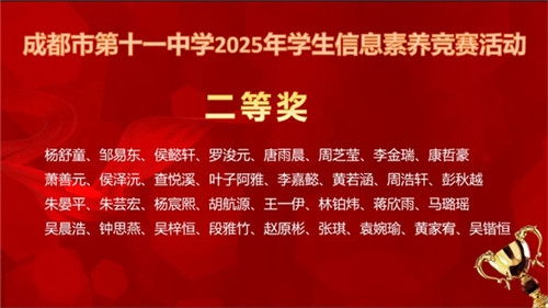 经过紧张而有序的比赛环节和严谨公正的评审,最终共有4名学生荣获特等奖,30名学生荣获一等奖,33名学生荣获二等奖,26名学生荣获三等奖。同学们在比赛中不仅收获了荣誉,更获得了一次宝贵的成长经历。他们锻炼了临场应变能力,增强了对信息知识的理解,也体会到团队协作与个人努力并重的重要性。