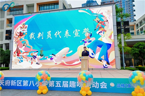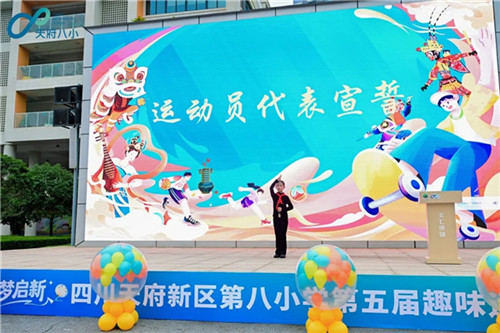 校旗方队率先入场,趣味运动会会徽闪亮登场,天府八小运动会正式拉开帷幕。