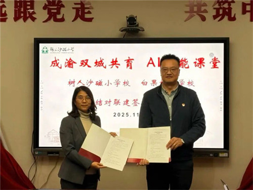 在教学展示之外,白果林小学与重庆市树人沙磁小学正式签约结成教育合作伙伴,以“成渝双城共育,AI赋能课堂”为主题,开启协同发展新征程。两校校长就校园文化、课程建设及学生活动进行了亲切座谈,共同约定未来将在教学研讨、学生互访等领域建立长期合作机制,携手共促教育高质量发展。
