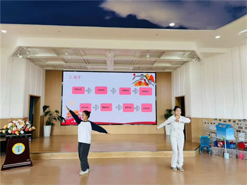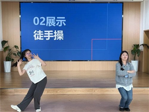 教师们纷纷对早操中的各个环节进行动作展示,让动作与音乐结合,更有利于大家对早操动作进行分析。
