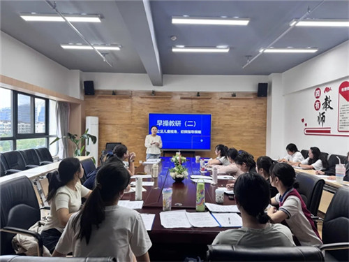 活动伊始,保教副主任钟声结合《3-6岁儿童学习与发展指南》中关于幼儿动作发展的核心要点,引导教师们明确不同年龄段幼儿的肢体协调性、力量发展等特点,为早操教研的科学性、适宜性奠定专业认知基础。