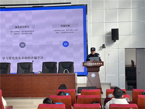 为进一步强化特殊学生的法治意识和安全防护能力,筑牢校园安全防线,切实保障学生身心健康,11月20日上午,彭州市特殊教育学校(以下简称:彭州特校)特邀繁江路派出所警官刘永波一行到校,开展法治安全宣讲活动,为全体学生送上了一堂生动实用的安全“必修课”。