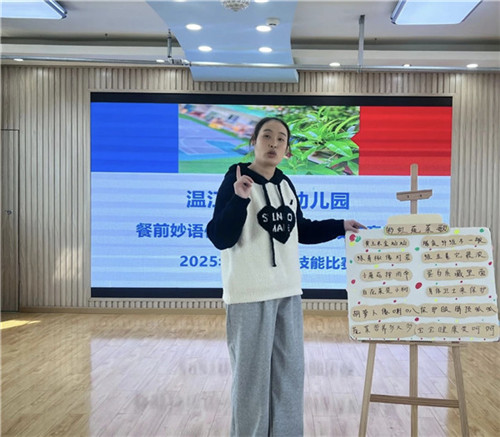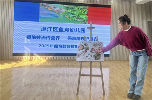 比赛当天,幼儿园多功能厅化身充满童趣的“餐前科普小课堂”,18位保育教师依次登台展示,以多元形式诠释餐前教育的无限可能,让营养知识“活”起来。