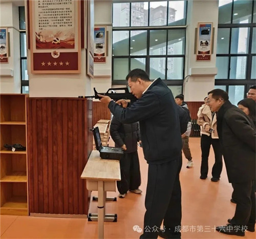 在谢江林的陪同讲解下,代表团依次参观了学校国防文化主题景观、国防教育主题展馆、国防装备库、国防专用教室、国防无人机馆及校史馆。来宾们深入了解了学校将国防文化系统融入校园环境的实践路径,并在国防教室亲身体验了射击等国防实训项目,对学校“环境育人、实景感人”的国防教育模式给予高度评价。