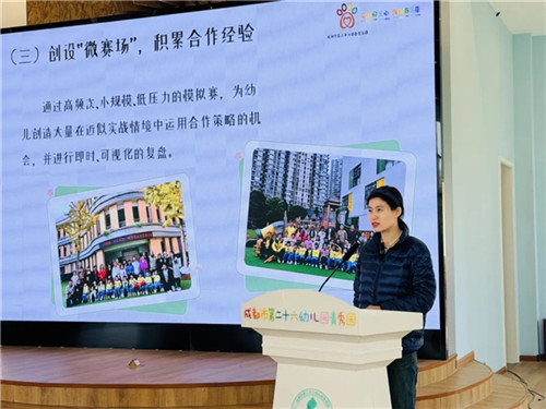 成大附一幼的高川梅老师在《绿茵征程,尽在足下》案例中,通过四个小案例展现了幼儿在足球游戏中表现出的勇敢、坚持与团队精神。陆露老师则以《竹跃童心舞动成长》为主题,介绍了幼儿在竹竿游戏中发现问题、解决问题的过程。