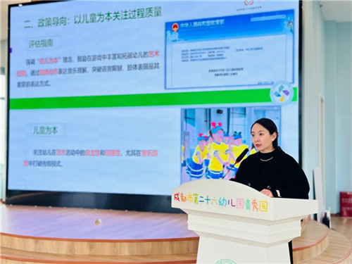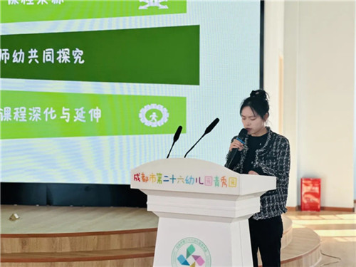 移步多功能厅,青秀园园点负责人季薇全面介绍了成都二十六幼教育集团的办园理念、发展历程、课程体系及师资建设、研培交流等方面成果,帮助新教师深入理解园所“悦”文化的内涵与实践。