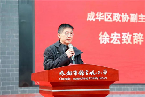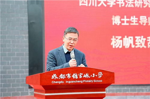 典礼现场,锦官城小学党支部书记彭学明率先致辞。他详细介绍了学校以书法教育为特色的育人实践,重点阐述了“书法+”融合育人模式——将书法与德育、智育、传统文化教育深度融合,构建沉浸式校园美育生态的探索与成效,并承诺学校将持续深耕书法教育,为传承中华文脉、培育时代新人贡献力量。