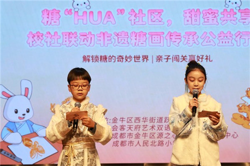 舞台上,从活力四射的糖画介绍,到历史悠久的“糖话”探讨,再到朝气蓬勃的“糖话”解读,孩子们的精彩表演,是对糖画文化的生动普及,充满创意与激情的表演赢得了社区居民掌声不断。