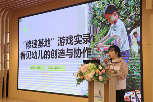 在短暂的茶歇后,何静老师聚焦“修建基地”进行了《“修建基地”游戏实录:看见幼儿的创造与协作》游戏案例分享,通过真实、生动的案例,具体分析了如何通过观察解读幼儿游戏行为,进而提供有效的教育支持,提升保教实践的科学性与有效性。