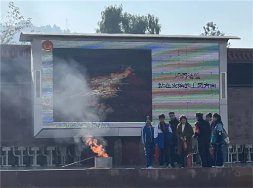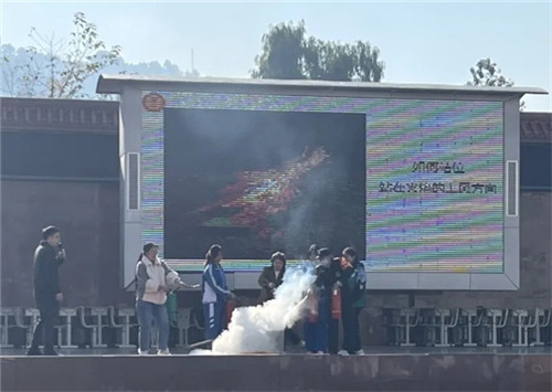 老师手把手示范“提拔握压”四步法,师生代表轮番上阵,3秒扑灭油盆火,白色粉雾在阳光下划出安全弧线。