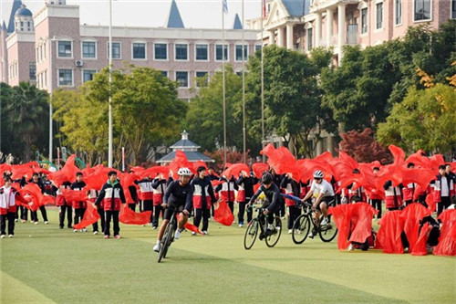 随后的火炬传递仪式成为传承奥林匹克精神的最好诠释,射击冠军万海洋同学领跑第一棒,师生们接力绕场一圈。火炬台被点燃的那一刻,全场凝神注视。