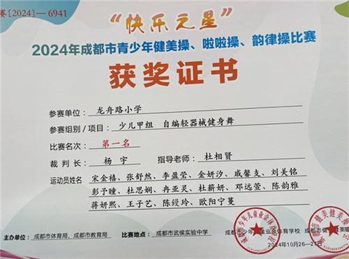 学校以“泼彩”之势,推动体育与美育融合,构建“墨分五色”活动体系。自编健美操表演荣获省、市一等奖。体育教师创编舞蹈《出征》,融传统伞舞于啦啦操,参加区运动会开幕式展演。设立“五彩积分银行”,激励学生在“成长看板”上描绘进步轨迹,激发内在动力。