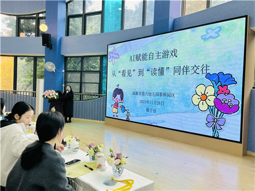 在《3-6岁儿童学习与发展指南》的引领下,成都市第六幼儿园蔡桥园区(以下简称:成都六幼蔡桥园区)高度重视自主游戏对幼儿社会性发展的重要价值。针对教师在游戏实践过程中面临的诸多挑战,园区积极响应国家“人工智能+教育”战略导向,探索AI赋能教育的融合路径。2025年11月26日,成都市第六幼儿园教育集团携手青羊区第四届名校(园)长张梅名师工作室,于成都六幼蔡桥园区进行“智观・趣玩:AI赋能幼儿自主游戏同伴交往行为的解读与支持”教研活动。