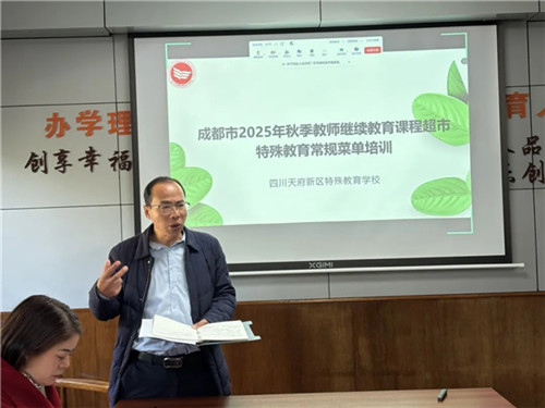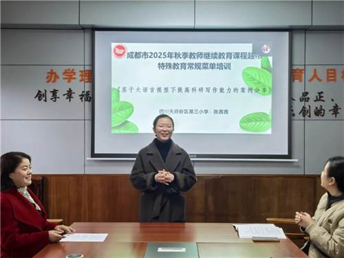 为持续推动大语言模型技术与特殊教育教学、科研工作的深度融合,提升特教教师的实操应用能力与科研创新水平,2025年11月27日上午,成都市2025年秋季教师继续教育课程超市特殊教育常规菜单第四期培训在四川天府新区特殊教育学校(以下简称:天府特校)正兴校区成功举办。本次培训聚焦“AI技术在特教教学与科研中的实操落地”,邀请四位经验丰富的教师带来针对性分享,为参训教师奉上了一场兼具理论深度与实践价值的学术盛宴。