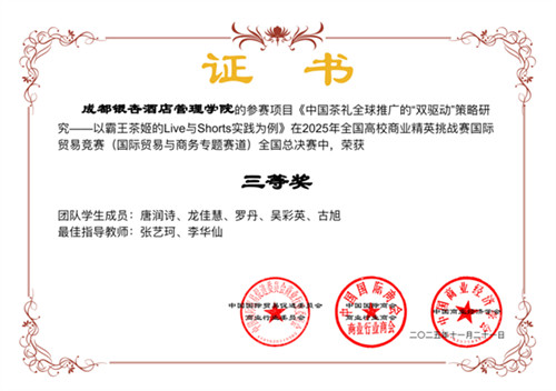参赛作品《中国茶礼文化的海外传播路径研究——以小红书平台为例》以及《中国茶礼全球推广的“双驱动”策略研究——以霸王茶姬的Live与Shorts实践为例》均荣获全国三等奖。两项作品均立足中国茶产业,深入探索新媒体环境下文化“出海”的创新路径,展现出该校学生敏锐的行业洞察力和实践能力。