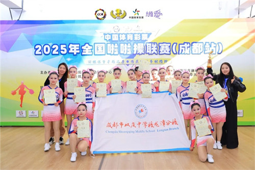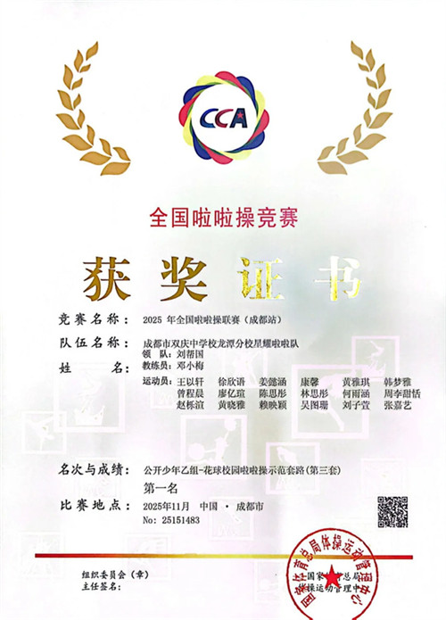 在成都市双庆中学龙潭分校邓小梅老师的悉心指导下,星耀啦啦队凭借扎实的基本功、默契的团队配合与昂扬的精神风貌,全力以赴,奋勇争先。最终,在公开少年乙组——花球校园啦啦操示范套路(第三套)比赛中,斩获第一名的优异成绩,充分展现了双庆龙潭学子顽强拼搏、积极进取的青春风采!