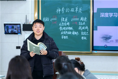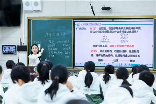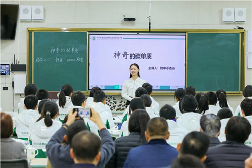 在课例研讨环节,该校理综组化学教师刘嘉利执教九年级《神奇的碳单质》一课。刘老师以“结构—性质—用途”为主线,通过实物展示、实验探究、小组汇报等形式,引导学生从生活中感知碳单质的多样性,在动手实践中建构化学观念。