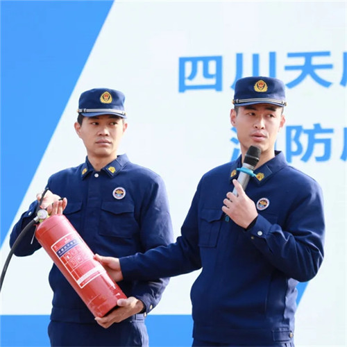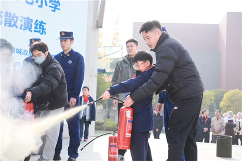 消防员现场讲解并演示了干粉灭火器的正确使用方法——“提、拔、握、压”。