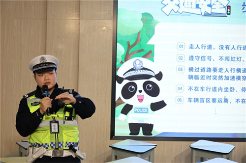 各班级学生代表率先开启交通安全知识的“先学之旅”。交警叔叔通过趣味互动问答,带孩子们认识交通标志、理解交通语言,并结合真实场景,细致讲解步行、骑行与乘车的安全规范,助力东娃娃们成为“出行安全小卫士”。