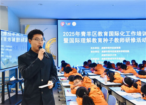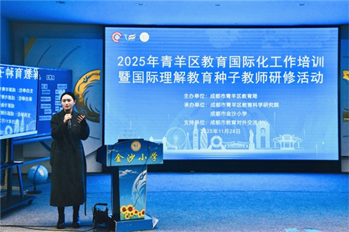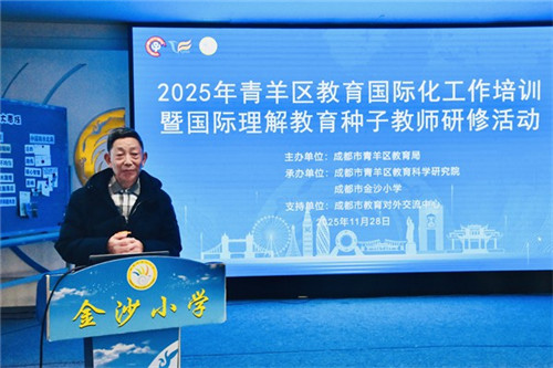 2025年11月28日下午,成都市金沙小学成功承办青羊区国际理解教育中心组首次月度教研活动。乐山师范学院教授、四川省中小学教师国培首席专家、成都市常青树计划特聘专家徐文基,成都市金沙小学专职副书记、A区执行校长赵德钊,青羊区教育科学研究院国际理解教育教研员仁青草,以及各小学种子教师共同参会,大家围绕“全球化与相互依存”主题展开深入研讨。