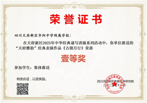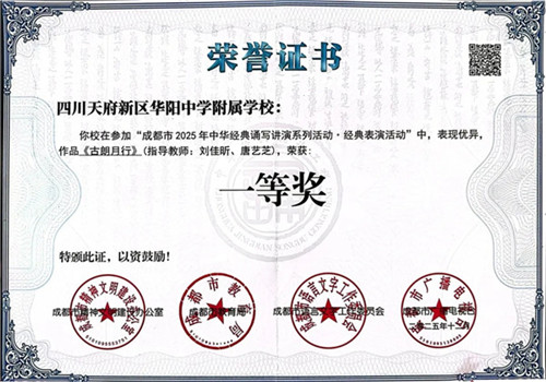 近日,成都市2025年中华经典诵写讲演系列活动评选结果陆续揭晓,四川天府新区华阳中学附属学校(以下简称:华中附校)报送的经典表演作品《古朗月行》凭借深厚的文化内涵与精湛的舞台呈现,在区级、市级赛事中接连斩获一等奖,尽显学校中华优秀传统文化教育的丰硕成果。