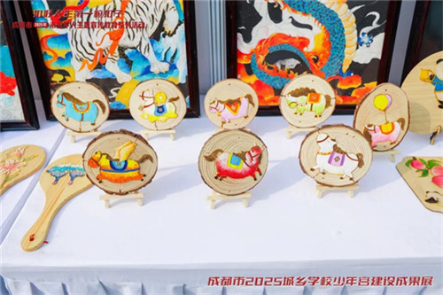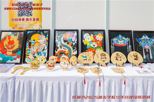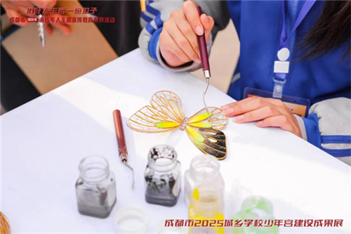 展区现场,芦葭学校以“匠心童韵·金丝绘蓉城”为主题,搭建12平方米沉浸式体验区:长桌展示《太阳神鸟》《芙蓉花开》等60幅珐琅画及若干圆盘摆件,金丝流光,釉色生辉,吸引嘉宾驻足拍照。三轮“小小非遗传承人”互动体验,由九(2)班胡雨馨、八(1)班周芯颜、七(2)班李晨曦示范“捋丝-掐丝-点蓝”核心步骤,观众排队体验,共完成迷你书签若干件,现场赠送“成都东进”定制图案,气氛热烈。