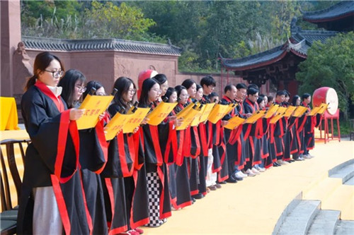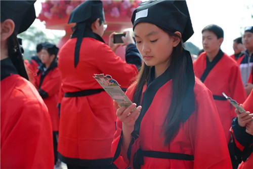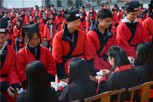 学子们沉浸式参与进献束脩六礼、进茶、进献拜师帖、训诫书、师者授礼等拜师环节,每一步都非简单模仿,而是在国学导师的引导下,思辨“礼”背后的尊师重道与“反求诸己”的修身哲学。