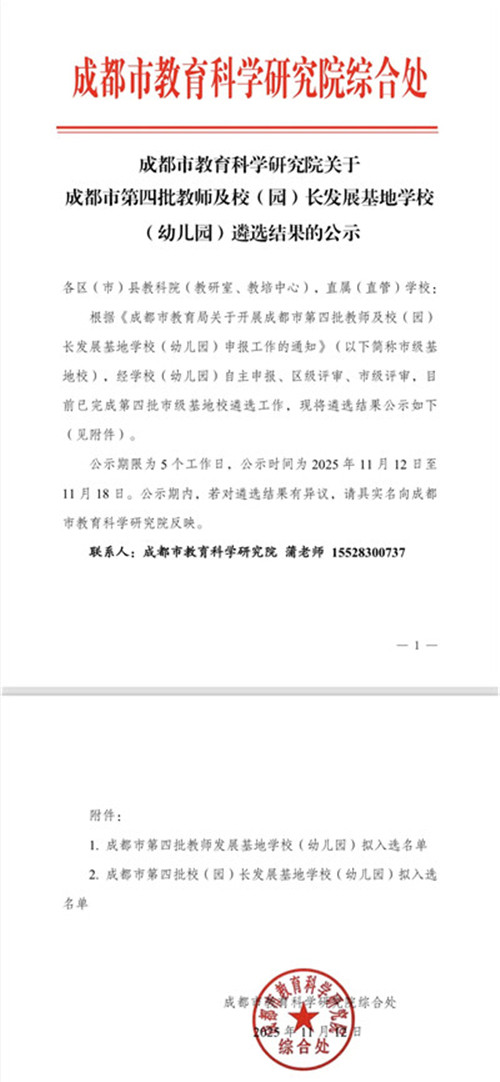 2025年11月20日,四川天府新区华阳幼儿园成功入选“成都市第四批园长发展基地学校(幼儿园)”。这是该园自该项目启动以来,连续第四次获此殊荣,标志着华阳幼儿园在学前教育人才培养方面的实践与模式获得了持续认可。