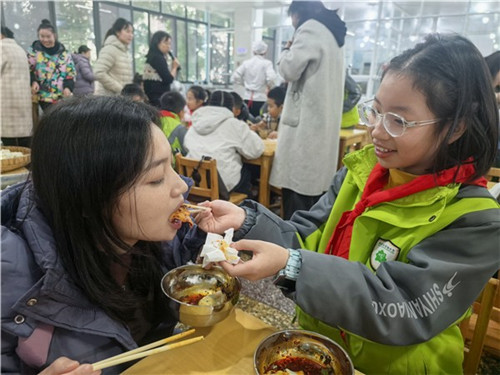 “开吃啦!”当盛满热腾腾饺子的碗递到手中,氤氲的热气模糊了眉眼,却暖透了心房。孩子们有的踮起脚把第一个饺子送到妈妈嘴边,有的捧着碗跑到老师面前。鲜美的汤汁在嘴里散开,韭菜的清香混合着肉馅的醇厚,更有分享带来的甘甜在舌尖萦绕,孩子们吃得格外认真,因为他们知道,这碗饺子里,藏着自己的汗水与努力。