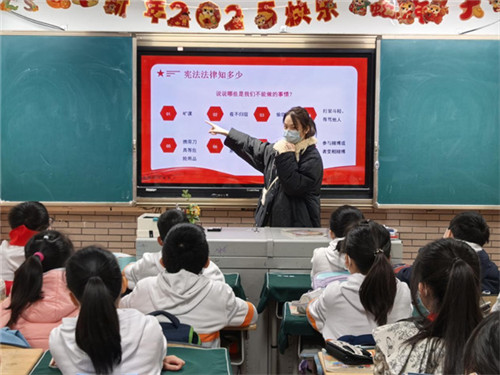 班队会上,班主任利用形象的实例,让学生了解宪法知识,知道宪法是根本大法,让学生崇尚宪法,维护宪法。主题班会强化了学生法治观念,让宪法精神内化于心,让法治的种子在孩子们的心中生根发芽。