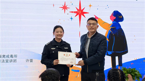 主题宣讲环节结束后,学校分管德育的毕副校长为许老师颁发“法治校外辅导员”聘书,正式聘任她为学校校外法治教育指导人员,为后续常态化开展法治禁毒教育奠定基础。随后,同学们与宣讲团老师共同合影留念,定格下这场充实的禁毒学习之旅。