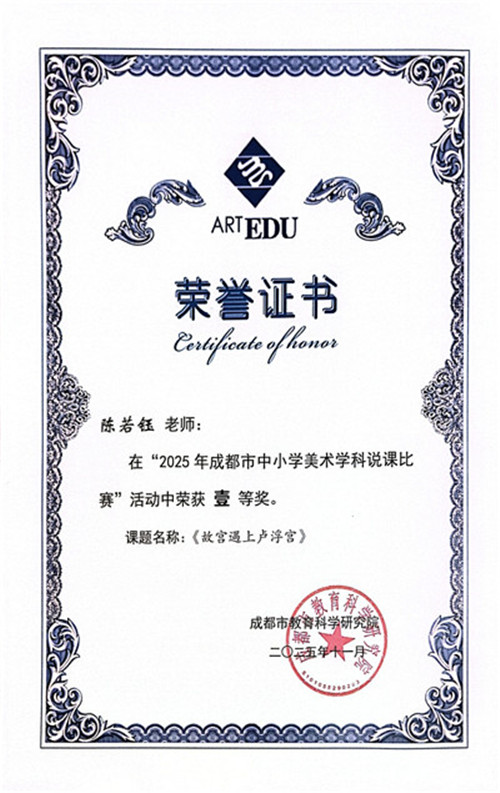 与此同时,在“2025年成都市美术说课比赛”中,陈若钰凭借独具匠心的课程设计、生动清晰的表达以及对美术教育内涵的深刻理解,赢得评委一致认可,荣获市级一等奖。