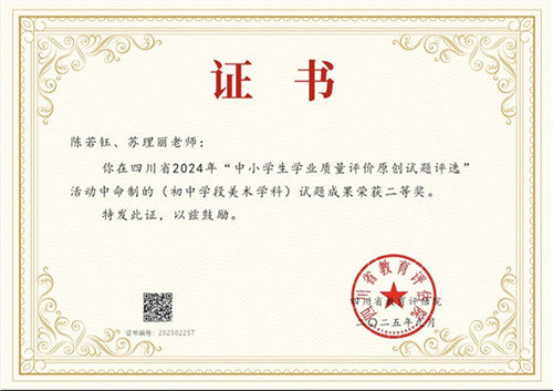 在四川省2024年“中小学生学业质量评价原创试题评选活动”中,陈若钰精心设计的美术学科原创试题,从众多参赛作品中脱颖而出,荣获省级二等奖。该试题紧密结合艺术课程标准,注重考查学生的审美感知、创意实践与文化理解能力,体现了大邑县沙渠学校在艺术教育评价方式上的积极探索与创新。