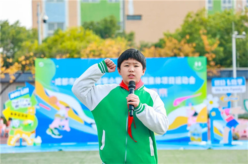 成都市双流区双华小学副校长陈永才致辞。陈永才代表学校欢迎各位家长的参与、感谢全体师生为运动会所做出的努力,鼓励小运动员们在集体项目中团结协作、赛出风采,享受运动的快乐,并预祝本届运动会圆满成功!