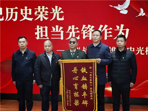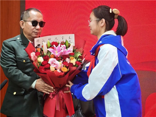 活动尾声,致敬仪式简朴而隆重。学生代表手捧鲜花缓步上前,向英雄致以最崇高的敬意;学校领导代表全体师生,向史光柱敬呈“铁血铸丰碑,丹心育栋梁”锦旗,既饱含着对英雄伟绩的崇高礼赞,也表达了全体师生将英雄精神内化于心、外化于行的坚定决心。史光柱与师生并肩合影留念,让英雄精神与新时代师生的昂扬姿态定格成永恒,成为此次爱国主义教育主题宣讲活动的珍贵见证。