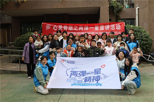 宣讲团始终将“国之大者”融入“民之关切”,深入城乡社区,把宏大的国家叙事转化为百姓可感可知的身边故事。在蒲江县大塘镇东岳村,志愿者们以“核力助双碳”为主题,用“拉家常”式的语言解读环保理念,通过珍贵历史影像生动诠释“热爱祖国、无私奉献,自力更生、艰苦奋斗,大力协同、勇于登攀”的“两弹一星”精神内核;结合趣味绘画、问卷调查等互动形式,让村民在“沉浸式”参与中感悟科学力量与家国情怀。在龙泉驿区龙井村、锦江区红砂社区,团队创新“生活科普+红色教育”模式——从“香蕉辐射”等趣味话题切入,借助模型展示、绘本共读、拼图闯关、“恐怖箱”互动等寓教于乐的方式,将核电知识与科研精神融入亲子活动,在童真笑语中播撒强国信念,为构建长效科普机制提供了鲜活样本,真正让红色精神“飞入寻常百姓家”。