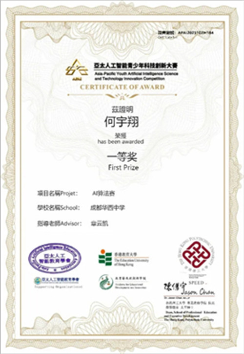 2025年10月5日,APAI亚太人工智能青少年科技创新大赛(中华区)在中国香港国际会展中心圆满落幕。四川省成都华西中学高一7班何宇翔同学,在AI算法大赛(中学组)中表现优异,斩获APAI中华区金奖。
